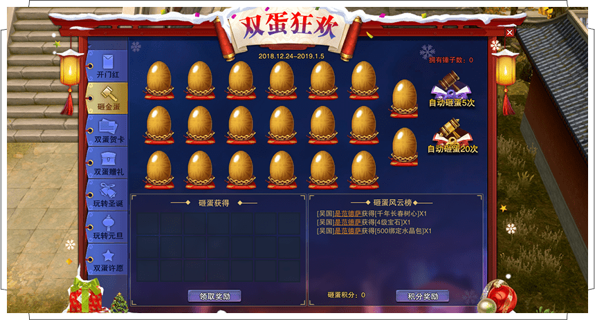 最受欢迎的砸蛋如期而至!今年金蛋大升级!稀有时装“珈蓝凤舞”、“罗兰妖姬”艳丽登场,稀有幻形“笨笨熊”稀世再临,稀有武器时装“印章”首度亮相,更有7级宝石、神灵丹、高级灵兽阵法书匣等梦幻奖励等着你!那么,就祝各位勇士欧气满满,一发入魂了!