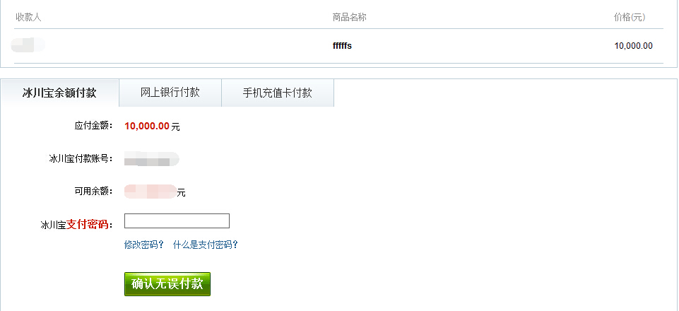再次确认商品信息无误后,点击"支付"按钮,即可跳转到冰川宝进行下一步的支付(如因某些原因无法当场支付,可在下单后的半小时内,到"我的订单"下的"未付款订单"中进行支付。超过半小时则默认放弃购买该商品,该商品自动重新上架)。
